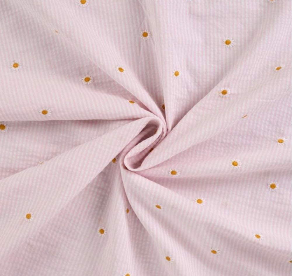 Intérieur oreille et col tissu coton marguerite brodé .